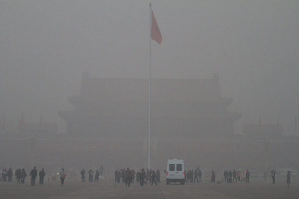 2月28日,北京雾霾袭城,天安门广场空气污浊能见度极差。