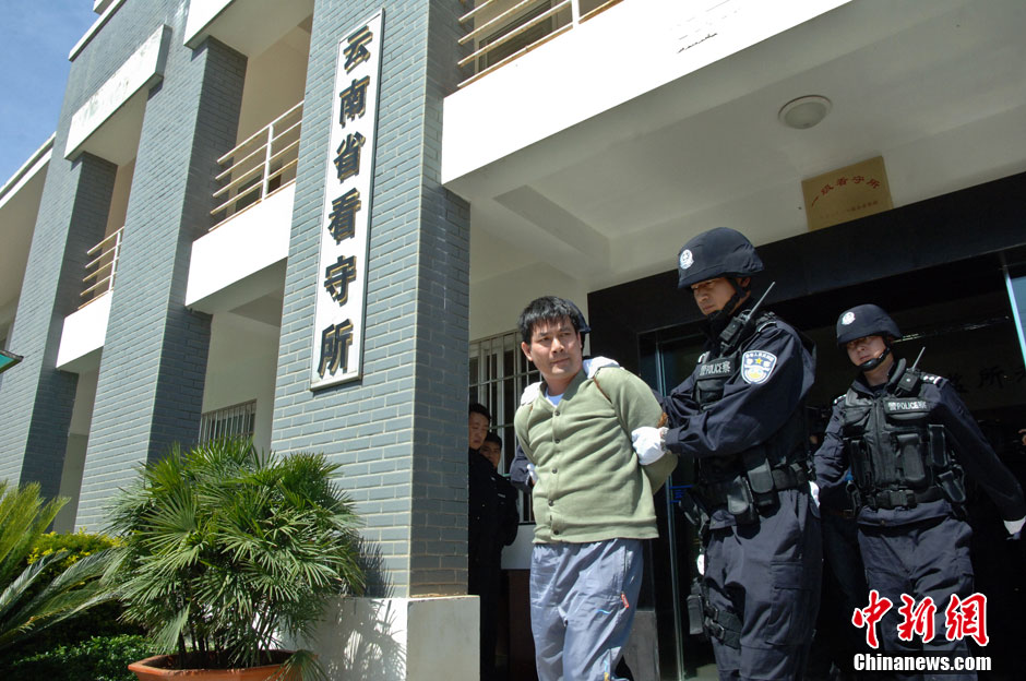 3月1日,根据最高人民法院院长签发的执行死刑命令,云南省昆明市中级人民法院依法对糯康、桑康·乍萨、依莱、扎西卡四名湄公河案罪犯执行了死刑。图为糯康被带出云南省看守所前往行刑地点。