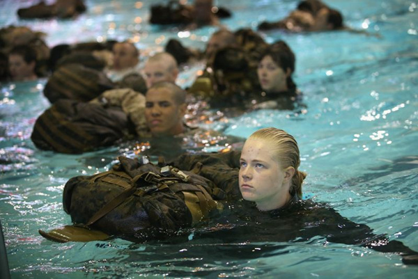 2月25日,美国南卡罗来纳州帕里斯岛上一处美国海军陆战队综合训练基地内,大量女新兵与男新兵一起混编队训练。训练中,女新兵与男新兵一样都要接受同样的军事训练科目。在美国海军陆战队编制内,女新兵大概约占总人数的6%。