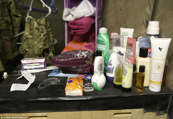 图为在临时搭建的梳妆台上,放着女兵们日常的生活用品,包括洗漱用品和保湿霜等。